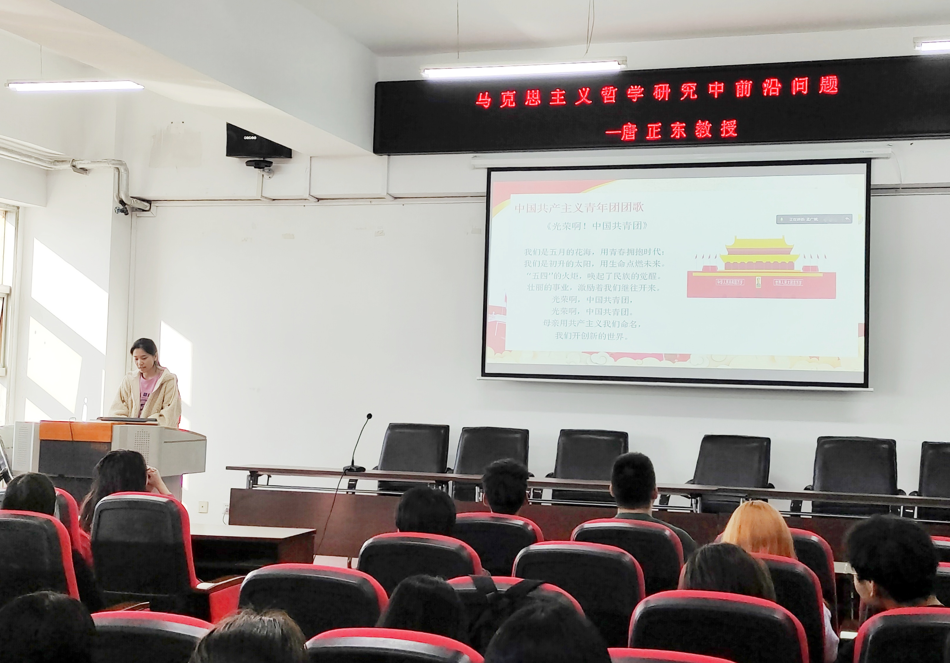 仪式的最后一部分为共唱团歌,哲学二班的团员同学一起唱团歌,在同学嘹亮的歌声中展现出新一代青年的风采,相信同学们定会惜时、自强、养德,肩负起历史使命。从现在做起,遵守团的章程,以团员的标准严格要求自己,为实现伟大复兴中国梦不懈奋斗。