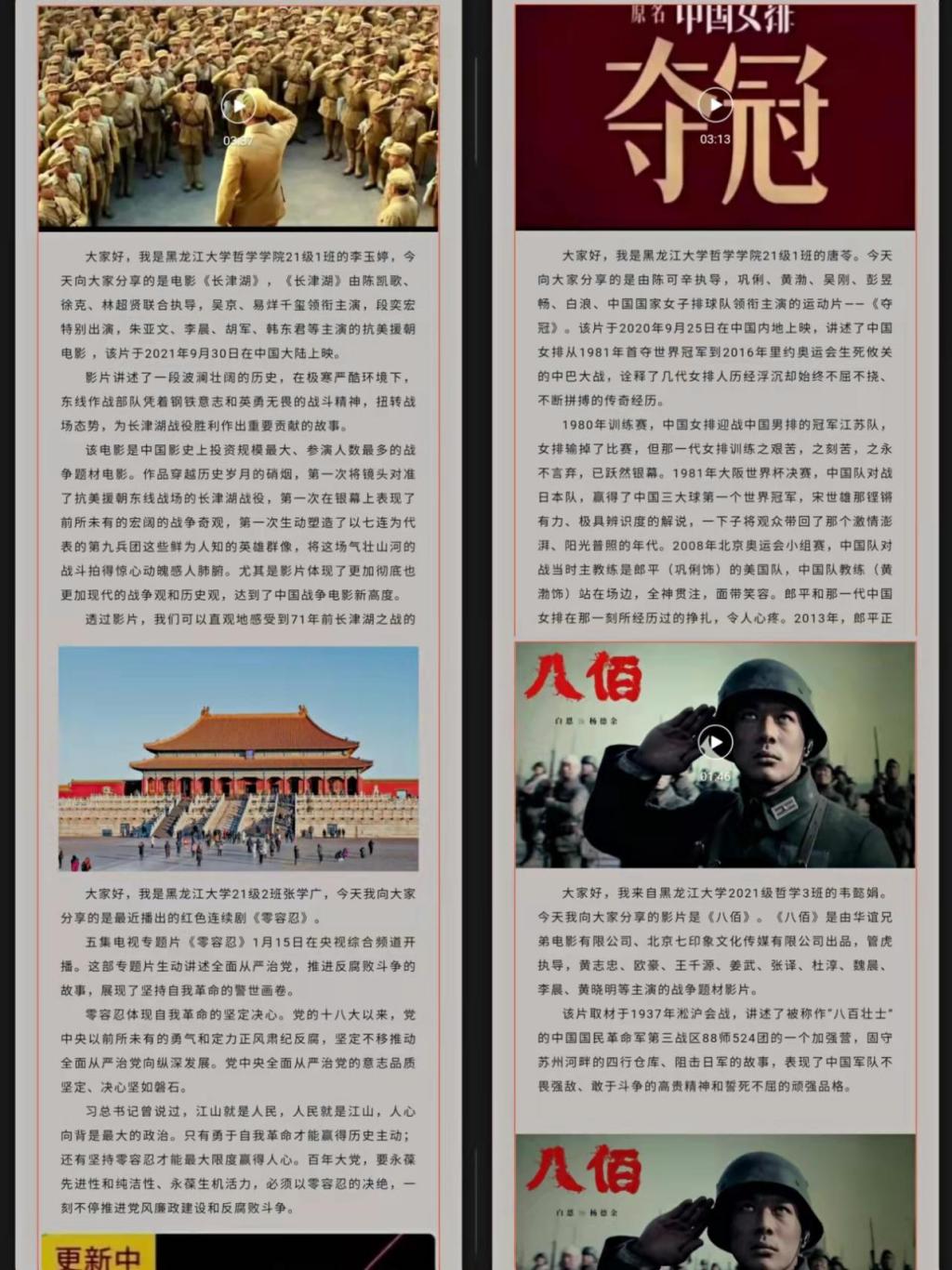 开展了打卡一部红色电影的活动,获得了来自大一、大二学年的广泛支持和热烈响应,我们通过两期推送,为大家介绍了几个国内脍炙人口的红色作品,弘扬正能量,引导啪啪啦