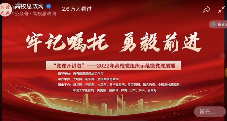 为喜迎党的二十大胜利召开,充分展示高校贯彻落实习近平总书记关于教育的重要论述、重要讲话、重要回信精神的做法成效,由教育部思想政治工作司指导的“牢记嘱托,勇毅前进”2022年高校党组织示范微党课第一、二期在高校思政网、新华网、光明网、共产党员网等网站公开直播。