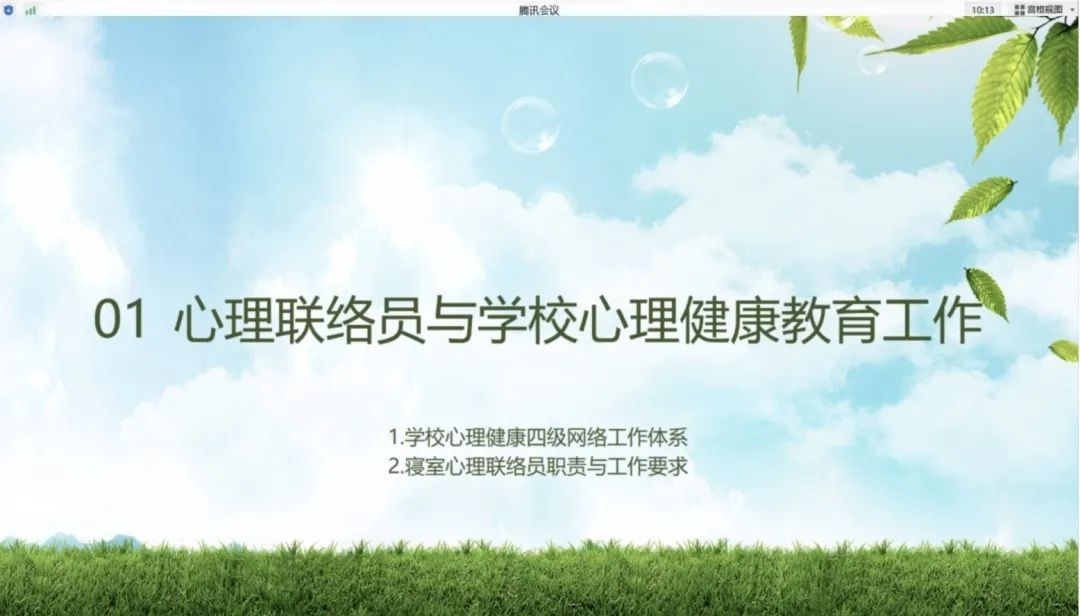 为帮助学生尽快适应大学生活,舒解学生在校期间的心理困惑、压力,提升心理联络员的责任与意识,帮助心理联络员掌握心理专业知识与技能以便能及时对同学进行心理疏导,使同学们得到帮助,协助同学们更好地适应校内环境,解决其在生活中或学习上出现的心理困扰和障碍,共同营造理性平和、积极向上的心态,营造真诚温暖、互关互爱的寝室环境,啪啪啦
