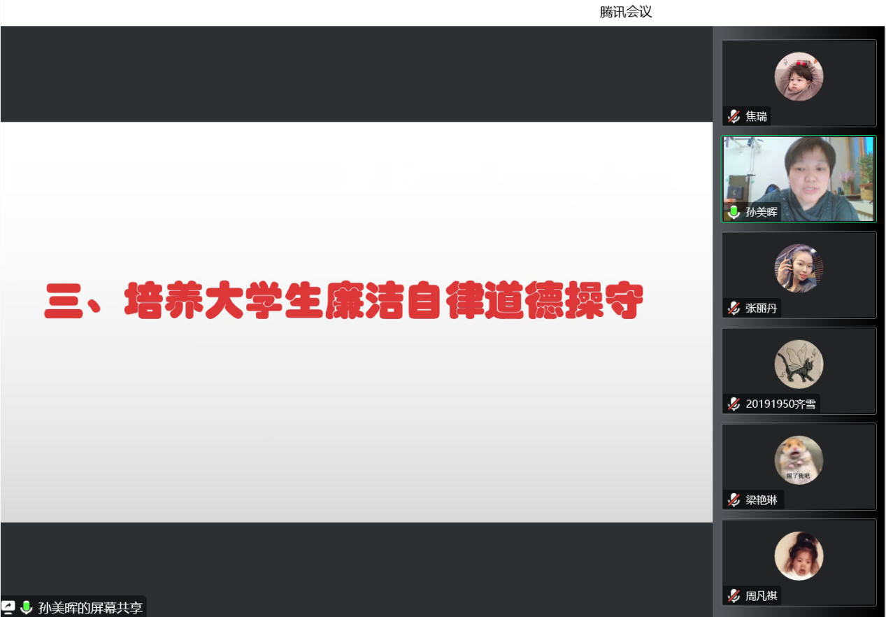 第三方面,培养大学生廉洁自律道德操守。孙书记列举了大学生中的不廉洁现象,比如考试舞弊、论文作假、骗取或恶意拖欠国家助学金和助学贷款、毕业就业缺乏诚信、部分学生干部行为失范等现象,孙书记呼吁学生党员要加强自身廉洁建设、思想建设,作为新时代的高校学生无论何时都一定要时刻严格要求自己。要加强诚信意识、诚实考试,不徇私舞弊。并强调新时代大学生要明大德、守公德、严私德,大德就是理想信念,公德就是宗旨意识,私德就是领导干部的个人操守。