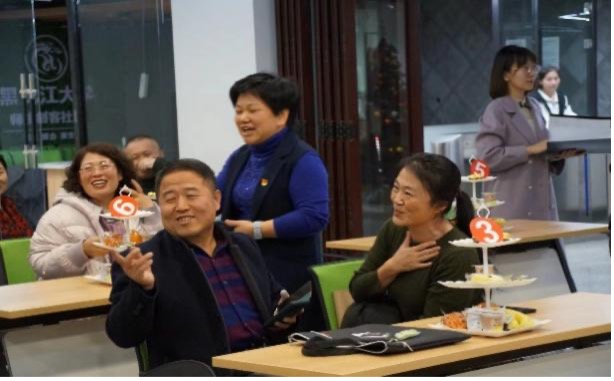 祝福满满,温暖在心。各位教职工一起参与学院精心准备的小游戏,先后展开了“五位一体”“比划猜”“托板传球”“党史知识竞答”“夹气球”等一系列小游戏,欢声笑语,笑颜如花,在欢乐中也充分展现了啪啪啦