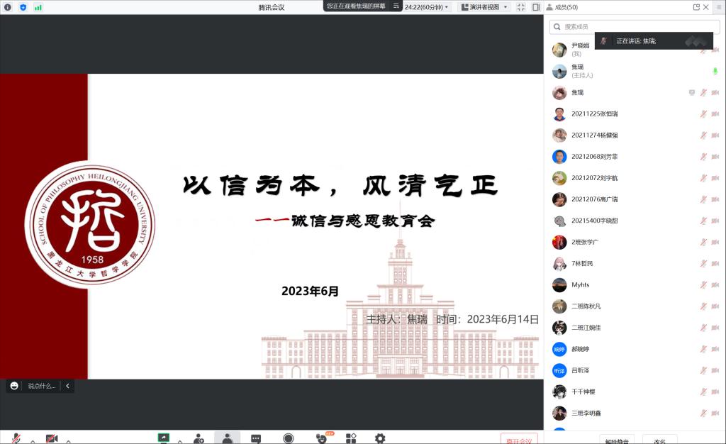 焦老师强调,作为大学生,要自觉做到做到诚信考试、诚信学术、诚信交友、诚信学习。作为社会主义建设者和接班人,要无论在小事情大事情中都坚持做人的道德底线,以诚信铸就人格,让诚信充盈在生活工作学习的方方面面,营造风清气正的班级氛围、校园环境,为社会健康活力发展注入力量。同时,焦老师强调,学会“感恩”,对于现在的同学们来说尤其重要,同学们应该学会对自己所拥有、享受的一切怀有感激之情,只有先懂得感恩,才会懂得关爱和回报。相信同学们会用白己的行动,以真才实学,去报答父母、报答师长、报答社会,报答所有关心爱护和帮助过我们的人,让我们的世界因感恩而更加美好灿烂!