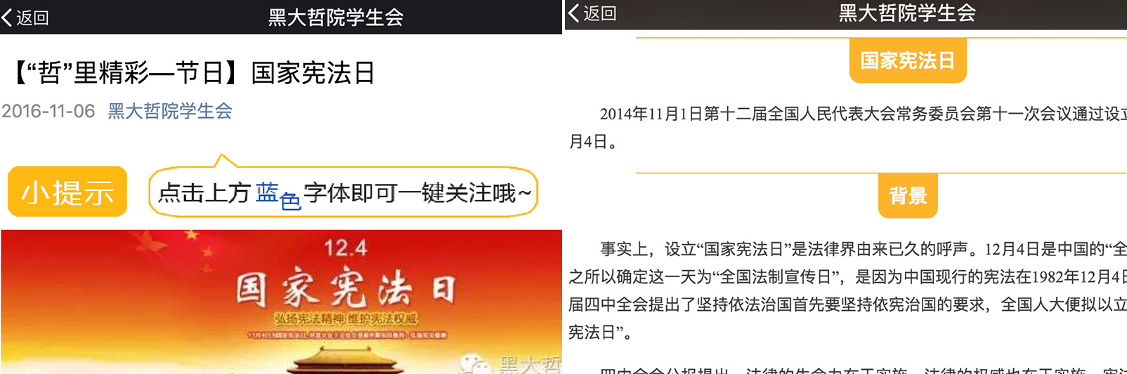 学生会网络部通过微信微博网络平台进行了有关宪法的内容推送。首先,推送内容对我国的国家宪法日进行了宣传。接下来,又对宪法的制定背景、过程、作用和意义进行了详细的介绍与说明。网络平台的宣传,有效地推动了宪法的传播和学习宪法活动的顺利开展,使更多同学了解和认识宪法的主要内容和基本精神。