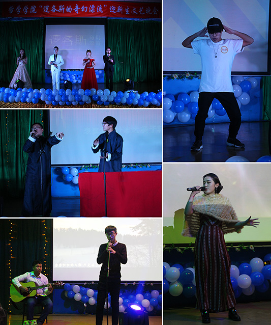 的青春活力,晚会正式揭开序幕。兴安龙江,山高水长。从离开家乡追寻梦想到黑大哲学学学院的不期而遇,因为有你,风雨中我也勇往直前,给我一个吻,融化冰冷温暖我心,让梦想永远坚定。王子齐同学演唱的歌曲《给我一个吻》带动了全场的气氛。紧接着由叶志达、杨子轩同学带来的相声表演引来全场阵阵掌声,迎来晚会第一个小高潮。随后,周晓莹老师为同学们带来的歌曲《你知道我在等你吗》以优美动听的歌声赢得了同学们的阵阵掌声。朗诵《这就是青春》和舞蹈《礼仪之邦》让全场观众屏息欣赏了青春的静默美好与中华传统古代舞蹈的美轮美奂。最后,晚会在啪啪啦