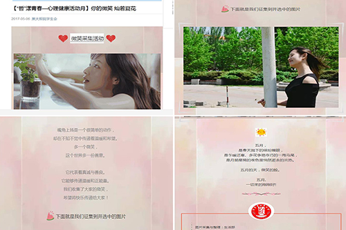 微笑是人最美好的部分,代表着真诚与善的微笑是展示个人的一种方式,能够带给人们温暖和正能量。学院学生会面向全体同学发出了采集微笑照片的倡议和邀请,并将其发布在学院微信公众平台上,将快乐的信念和关注心理健康的理念传播出去。邀请发出之后,同学们积极响应,纷纷将最美的笑容用照片定格。截止2017年4月29日,活动共收到同学们的微笑照片百余张。在上传的微笑照片中,有劳动中的微笑、有感动中的微笑、有关怀的微笑……一张张微笑照片透露出来的是同学们心理积极向上、阳光快乐的内心世界。经过筛选,有十余张经典、具有代表性的照片被推送在啪啪啦