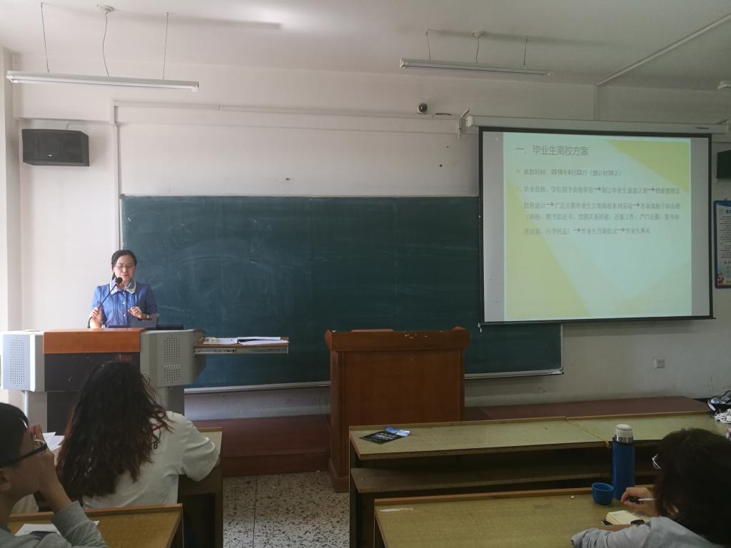 会议伊始,黄影老师对毕业生离校的具体工作进度进行了安排,对办理离校手续中的时间节点办理流程进行了说明,并提醒大家高度重视,按时按点完成手续办理工作。随后,黄老师结合安全离校、文明离校的要求,对毕业生的离校工作的纪律要求进行了重点强调。黄老师表示:即将离校,希望大家在最后的日子里,能够心怀感恩,自觉遵守校规校纪,爱护公共设施、维护寝室整洁,做到文明有序离校。紧接着,黄老师结合大家的疑问,对离校工作中的细节进行了详细的解释,以便大家都能够熟知工作流程,顺利、有序离校。会议最后,黄老师号召大家珍惜最后的黑大时光,为大学生话画上一个圆满的句号。