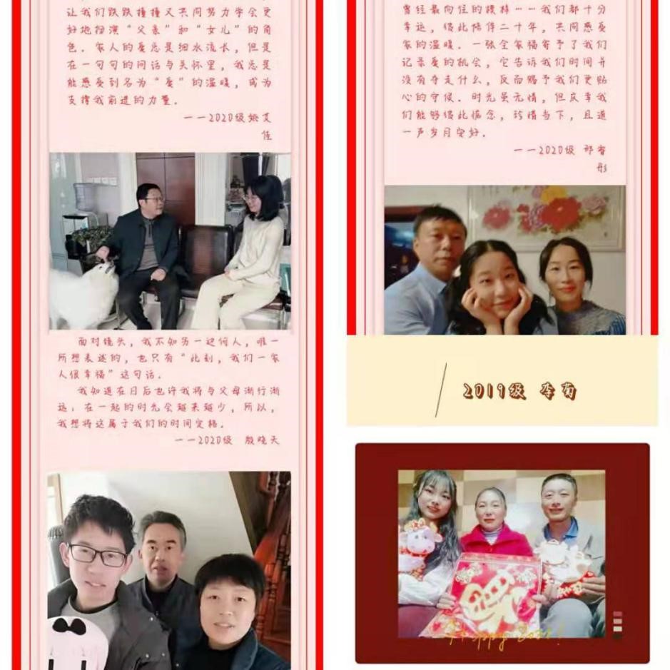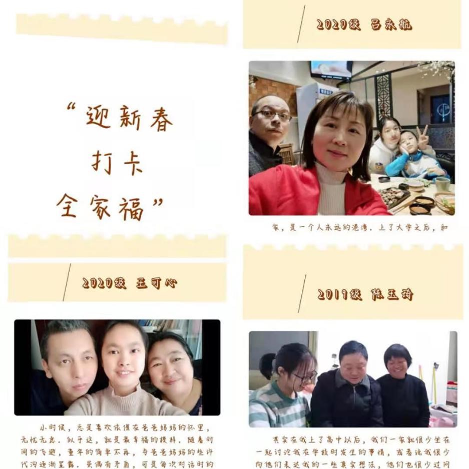开展“迎新春打卡全家福”主题活动,在居家时光中记录与父母的温馨时刻,鼓励学生和父母讲讲在学校的故事,讨论一下个人的规划与发展,把自己的真实想法与父母进行交流,在与父母的温暖沟通中增进家庭感情。
