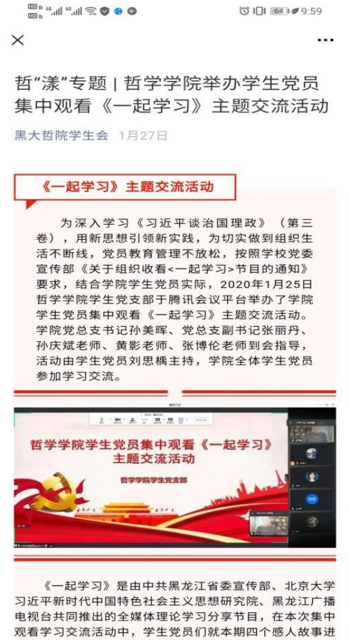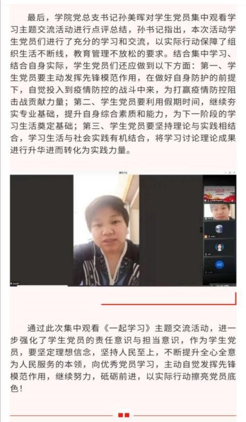各年级班级分别召开“学习‘四史’,走好新时代长征路”和“读书浸润心灵、共建精神家园”主题云班会活动,结合四史学习以及读书等主题,总结2020年度班级、个人的收获与成长,制定交流个人与班级在学业发展、创新创业、社会实践等方面的规划与目标,畅谈下一阶段的目标与成长发展计划。学院还组织学生党员举行了集中观看《一起学习》主题交流活动,趁热打铁巩固理论学习效果,促进学生以科学理论武装头脑,将学习与实践有机结合起来。