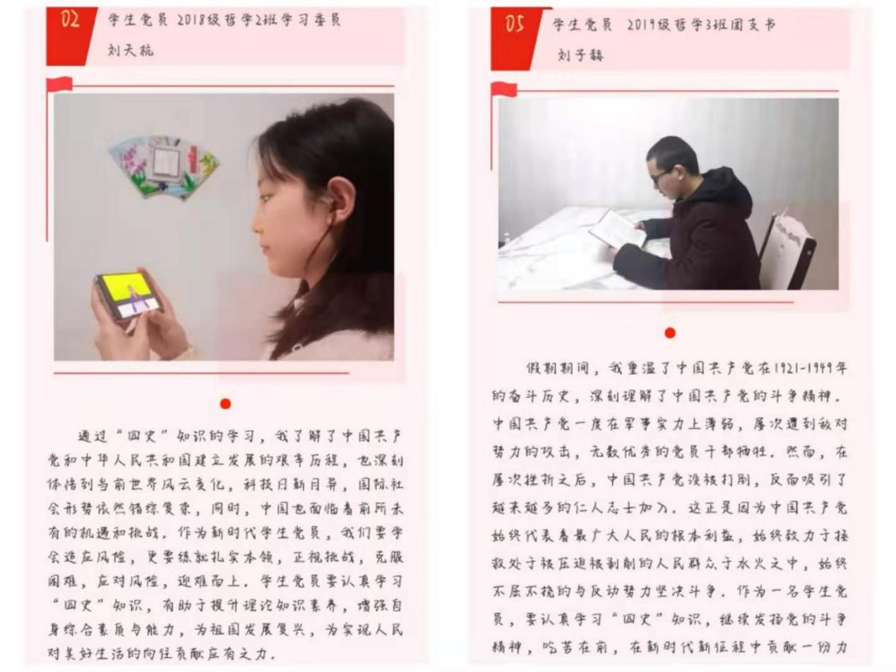 学生党员干部畅谈‘四史’学习心得感悟”等主题活动,学习革命先烈的英雄事迹,了解新中国伟大复兴的奋斗历程,感受改革开放伟大成就饱含的创新创造宝贵经验,领会社会主义发展史中坚定的理想信念,在学深悟透“四史”的过程中更加坚定制度自信。