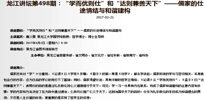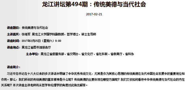“十三五”期间,哲学学科注重发挥高校教材在文化传承中引领作用,张锡勤教授和丁立群教授作为第一首席专家主编并出版“马工程”重点教材《中国伦理思想史》、《当代西方哲学思潮评析》;以国学学会为载体,整合优秀国学资源,通过“龙江讲坛”中华优秀传统文化系列讲座,省广播电台“古训今用”系列讲座,高校国学教育等活动形式,弘扬中华优秀传统文化。以啪啪啦