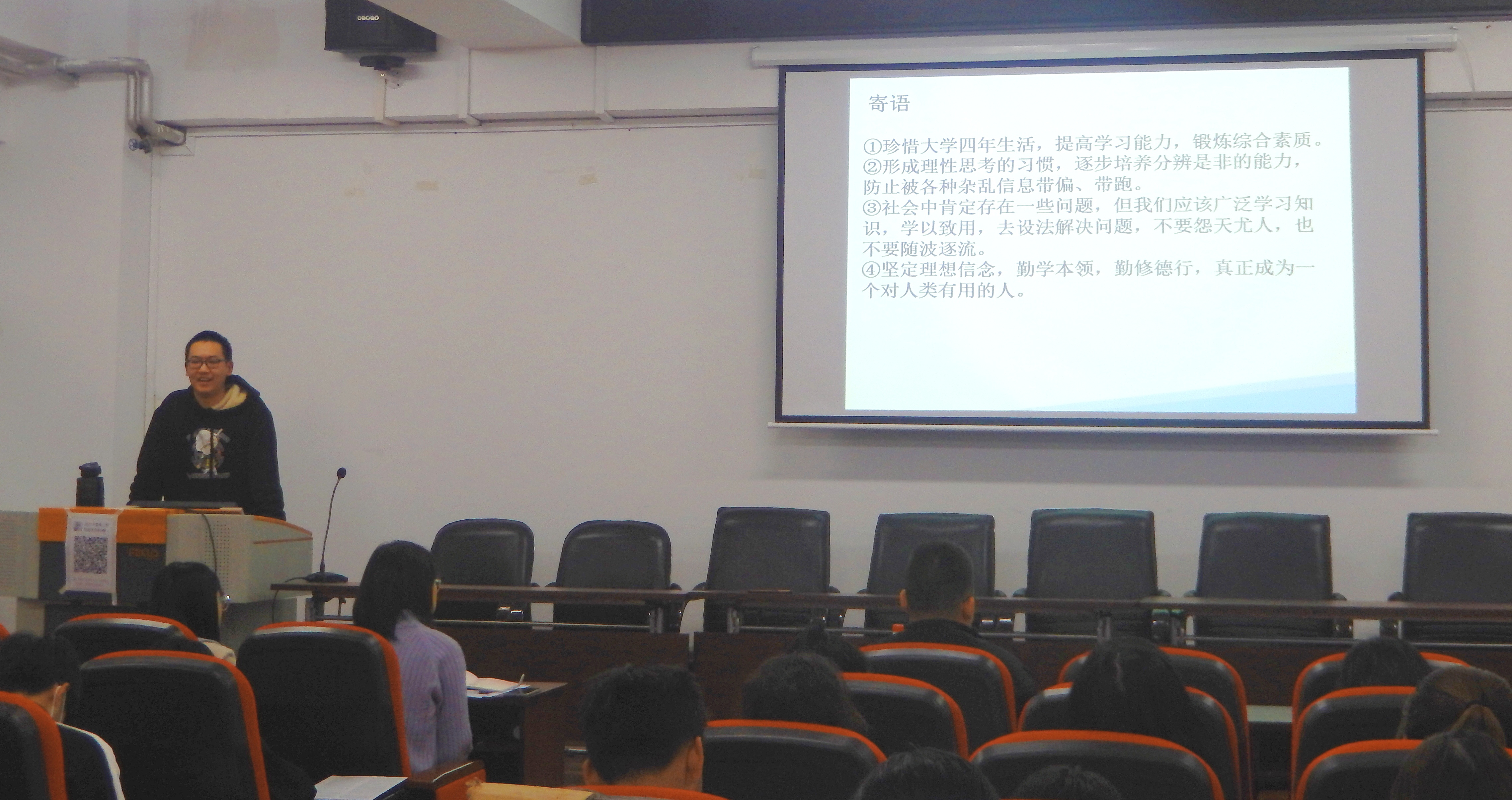 随后,刘子赫同学分享了他对哲学学习的意义和方法的一些想法和见解。他从非功利性、及真正学习哲学的方法等观点进行阐释。他围绕这个观点向新生从正侧面阐释他对哲学学习的真知灼见。台下的同学则屡屡爆发出热烈的掌声以回应。此外,刘子赫同学谈到要将哲学生活化,要留心生活中的哲学,重视与他人交流思想,形成“适应性”的人生观,懂得在沉浮中寻觅。