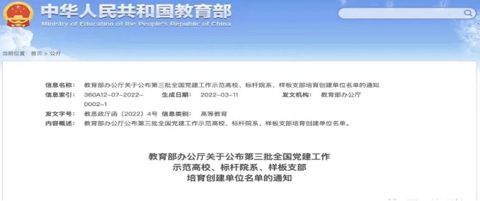 近日,教育部办公厅正式印发《关于公布第三批全国党建工作示范高校、标杆院系、样板支部培育创建单位名单的通知》(教思政厅函〔2022〕4号),啪啪啦