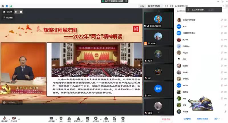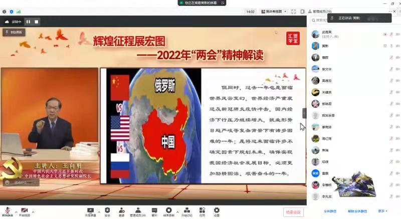 理论学习中心组成员共同观看学习了2022年两会精神解读讲座视频《辉煌征程展宏图》。此次专题讲座由中国人民大学习近平新时代中国特色社会主义思想研究院副院长、央视国际特聘专家王向明教授以《辉煌征程展宏图——2022年两会精神解读》为题,围绕全国两会召开的背景、未来工作的主要目标、高举旗帜向未来三个方面为大家做了全面、详实、清晰的深度解读。理论学习中心组学习后,教工第一党支部和教工第二党支部共同召开了主题党日活动,组织党员集中观看学习讲座视频《辉煌征程展宏图》。
