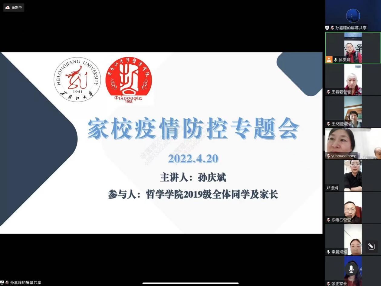 2019级全体家长及学生通报了当前哈尔滨市的疫情情况,并详细向家长汇报了本次疫情以来学校和学院采取积极措施应对疫情,学校实行全封闭管理,有1500余教职员工入住学校,确保日常教学有序开展,学校投入大量人力、物力、财力,为在校学生提供后勤和生活保障,安全的校园生活环境可以做到让学生安心、让家长放心。接下来,孙老师强调,所有同学一定要按照哈尔滨市政府的第60号公告以及学校疫情防控的相关公告严格要求自己,切忌违反相关规定。同时也吁请家长协助,与学生多联系、勤沟通、常提醒,确保无违反疫情行为发生。最后,孙老师也提醒同学们,在疫情防控的同时要注意自己的身心健康,调整好自己的情绪,减少焦虑。如果遇到困难及时联系老师。