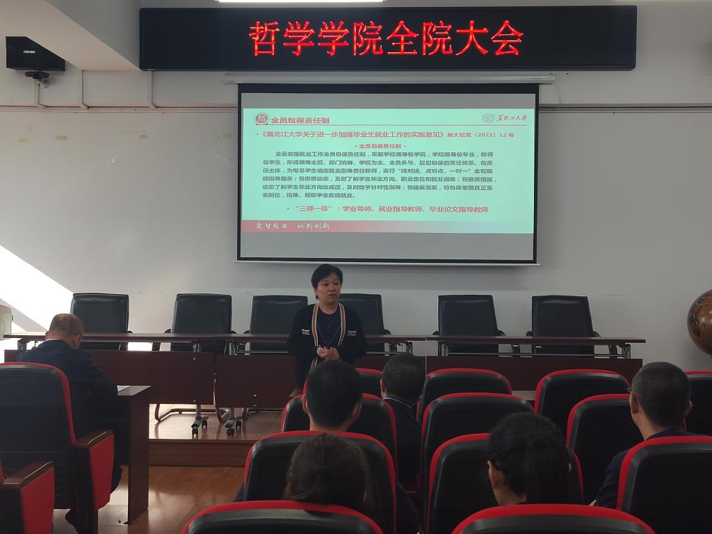 院长蒋红雨强调就业工作始终是学院工作的重点,要充分认识到做好毕业生就业工作是一项重要政治任务,结合学科平台、专业优势,从毕业生实际特点和需要出发,促进提升哲学专业毕业生综合素质与竞争力,扎实落实好就业工作全员包保责任制,形成学院上下全体教师高度重视就业工作的新局面。
