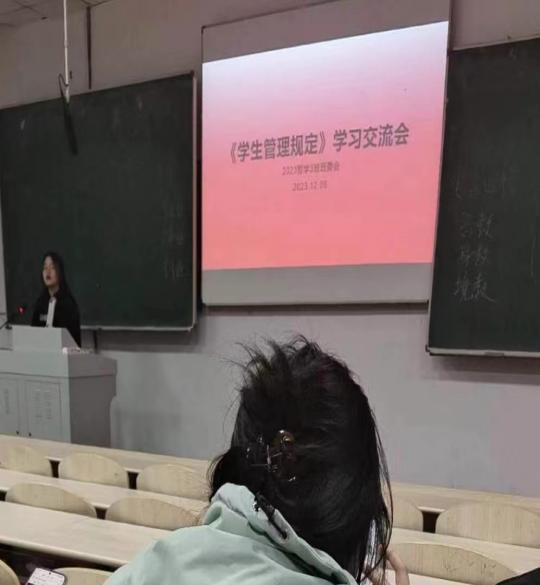 学生管理规定》的主题班会。班会上,班长米可心带领全班同学学习了日常管理规定,团支书侯佳乐、组织委员梁淇宣读了相关细则。之后,班长对重点问题,如选课、学业预警、家庭经济困难认定、学业贷款等进行了强调。本次班会不仅对《啪啪啦