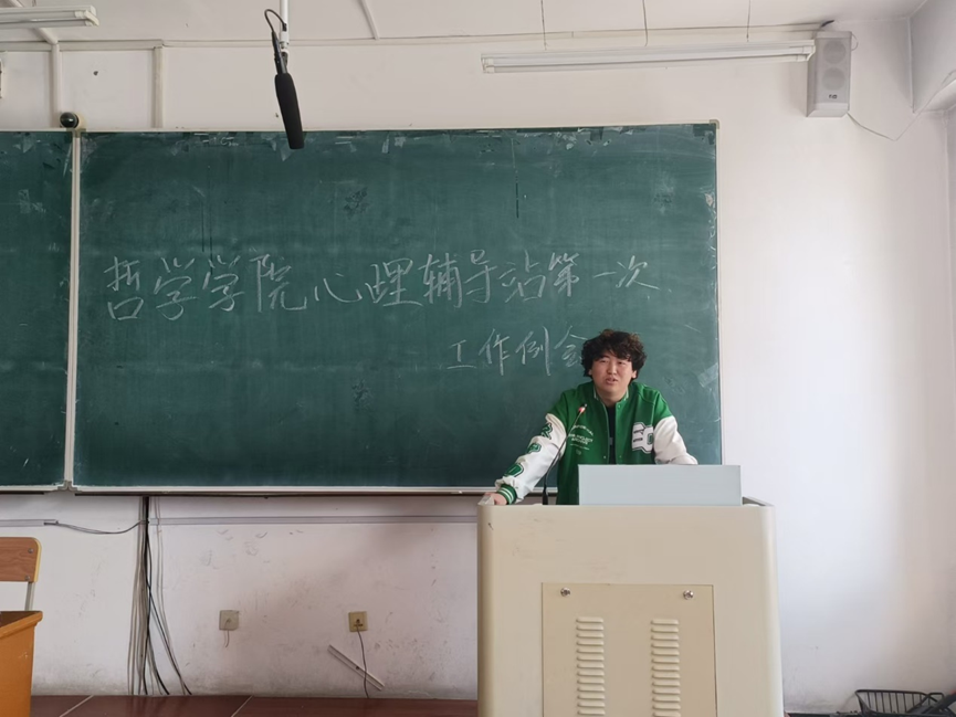 会议开始,二级心理辅导站副站长曹旭睿进行发言,提及二级心理辅导站的重要作用,强调要加强学校—学院—学生的重要关系,认为心理站干事应从学院二级心理辅导站为基,完善完成学校各活动安排,并且给哲学院各学生健康的心理活动体验,提醒各干事的职能作用,加强心理站与学生之间的联系。