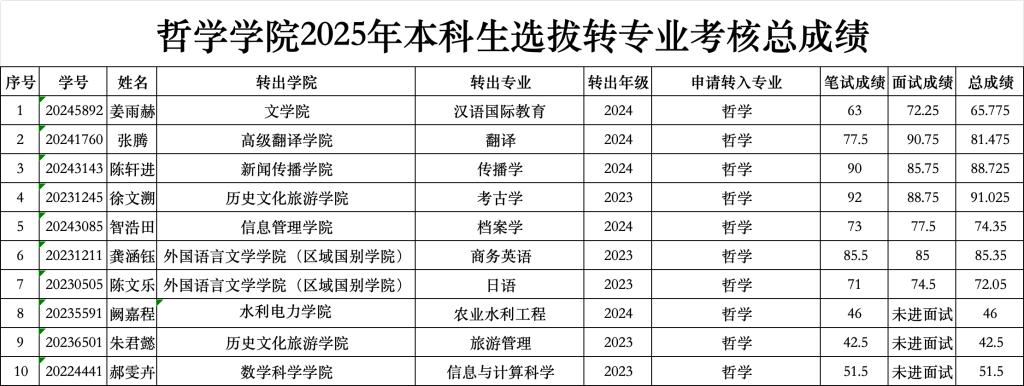 按照啪啪啦 2025年本科生选拔转专业工作方案要求,根据笔试成绩和面试成绩,现将啪啪啦 2025年本科生选拔转专业考核笔试成绩予以公布。