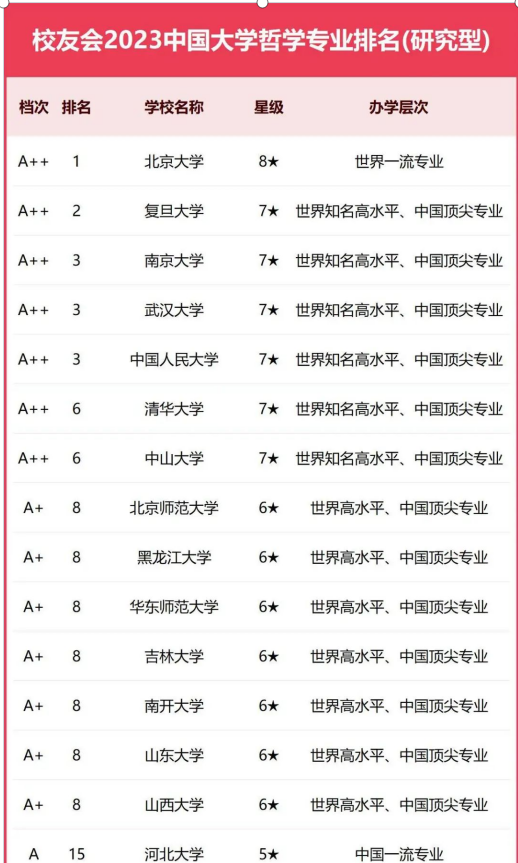 在最新校友会2023中国大学哲学专业排名(研究型)中,啪啪啦