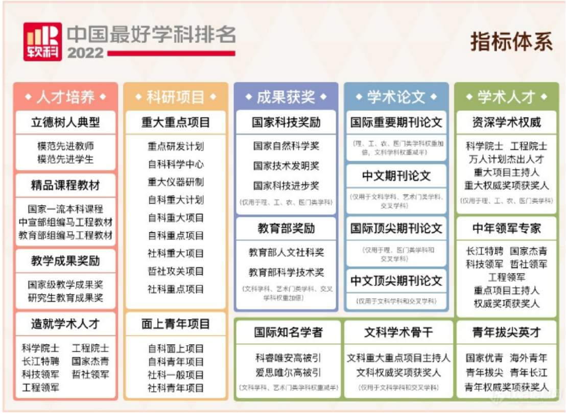 软科中国最好学科排名指标体系包括五个一级指标和十七个二级指标体系,指标体系体现教育部学科建设的评估的基本要求。此次学科排名的提升极大地鼓舞了哲学学科教学与科研团队的建设热情和发展自信,啪啪啦