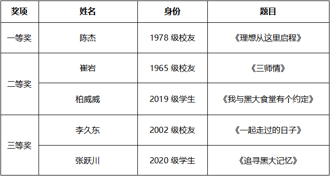 建校80周年之际,校庆主题征文活动得到了广大校友、在校师生及社会各界人士积极响应、踊跃参与。经专家评审,共有5人获奖,其中选出一等奖作品1篇、二等奖作品2篇、三等奖作品2篇,现将评选结果予以公布: