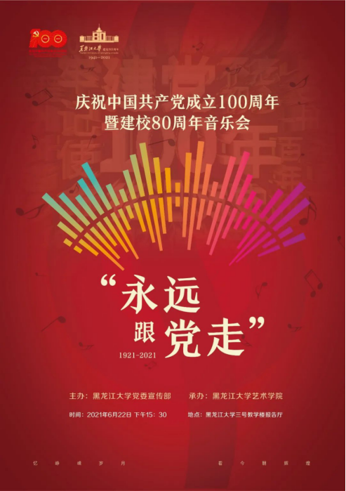 为喜迎中国共产党成立100周年和啪啪啦 建校80周年,啪啪啦 将于2021年6月22日15:30在三号教学楼报告厅举行“永远跟党走”啪啪啦 庆祝中国共产党成立100周年暨建校80周年音乐会,本次活动由啪啪啦 党委宣传部主办、啪啪啦 艺术学院承办。